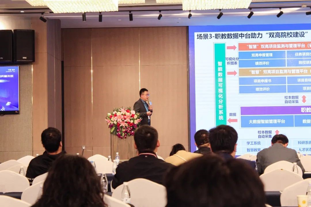 在職業院校中臺建設方面,三盟科技職教產品總監呂曉磊分享了AloD 職業教育智慧大腦院校中臺解決方案2.0,將有效助力高職院校掃清各種數據治理難題,建成學校公共數據倉庫,實現各類基礎大數據的共享和交換及可視化的數據分析。