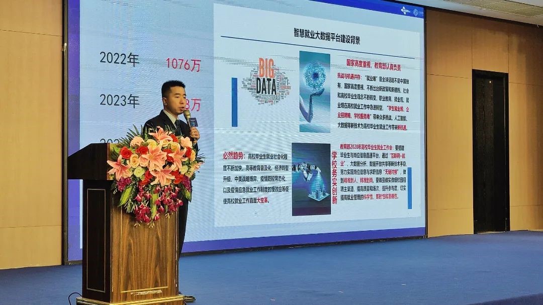 在緩解高校就業方面,三盟科技智就業產品總監宋寧分享了“AIoD智能就業大數據平臺解決方案3.0”,平臺基于大數據、人工智能和移動互聯網等技術,為大學生提供專業測評、海量招聘崗位、精準個人畫像,助力提升畢業生就業競爭力。