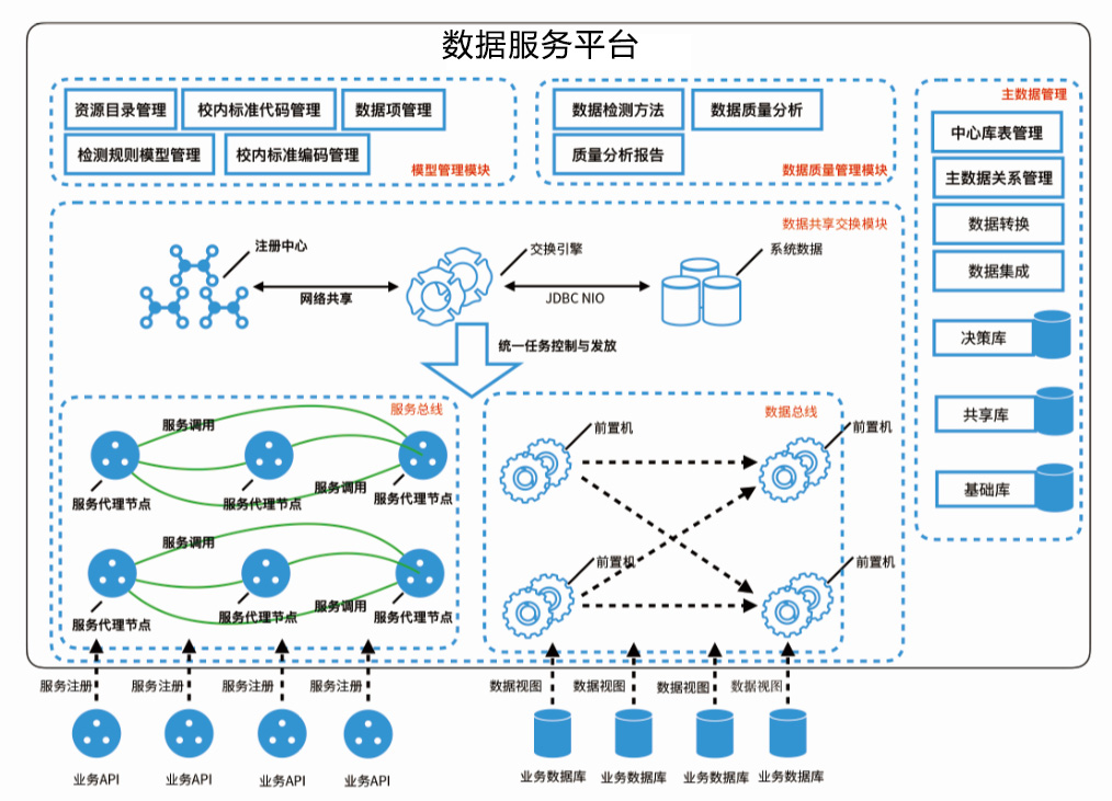 數(shù)據(jù)服務平臺是支撐學校數(shù)據(jù)管理的基礎,是以“統(tǒng)一標準”、“統(tǒng)一處理”、“統(tǒng)一交換”、“保證質量”、“透明開放”的方式,為不同業(yè)務系統(tǒng)、不同數(shù)據(jù)庫、不同數(shù)據(jù)格式之間進行數(shù)據(jù)交換而提供服務的平臺。