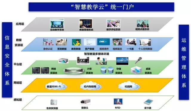 項(xiàng)目整體架構(gòu)按照五層兩翼設(shè)計(jì),其中五層包括:感知層、網(wǎng)絡(luò)層、平臺(tái)層、數(shù)據(jù)資源層和應(yīng)用層;兩翼包括信息安全體系和運(yùn)維管理體系。整個(gè)架構(gòu)涵蓋了智慧課室建設(shè)的方方面面,并且能很好的將整個(gè)信息化環(huán)境融合在一起,創(chuàng)造一個(gè)舒適的學(xué)習(xí)環(huán)境,豐富課堂教學(xué)方式,全面促進(jìn)教學(xué)創(chuàng)新的智慧型課室。
