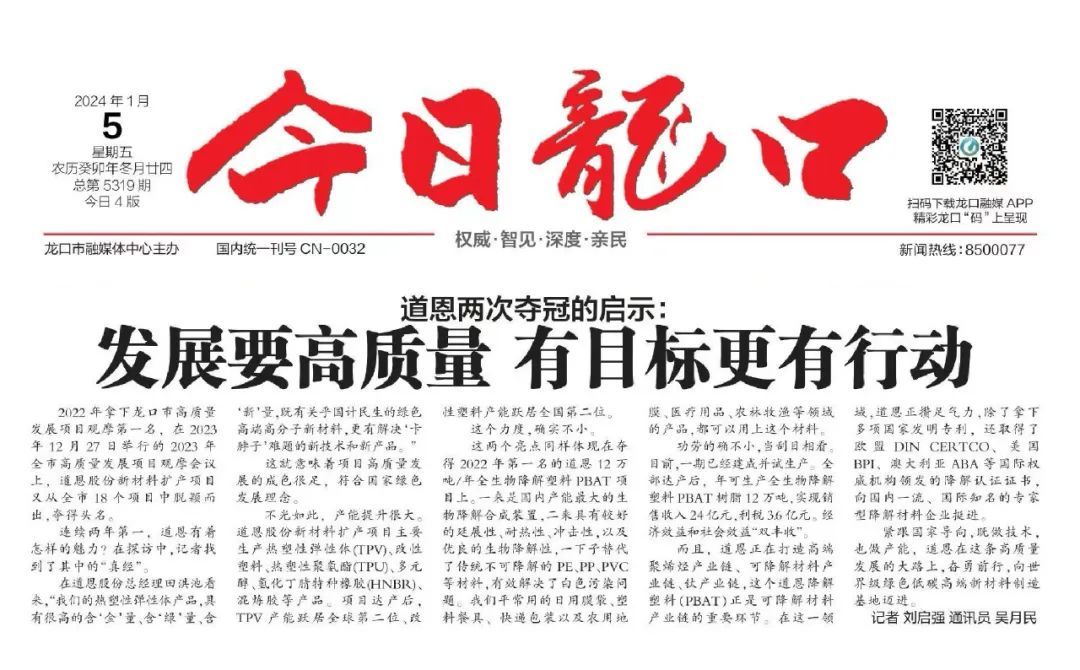 31日上午,在龍口經濟開發(fā)區(qū)(龍港街道)舉行的2024年高質量發(fā)展動員大會上,道恩集團榮獲2023年度“稅收突出貢獻企業(yè)”“項目投入突出貢獻企業(yè)”“外貿工作突出貢獻企業(yè)”,常務副總裁肖輝上臺領獎并作表態(tài)發(fā)言。
