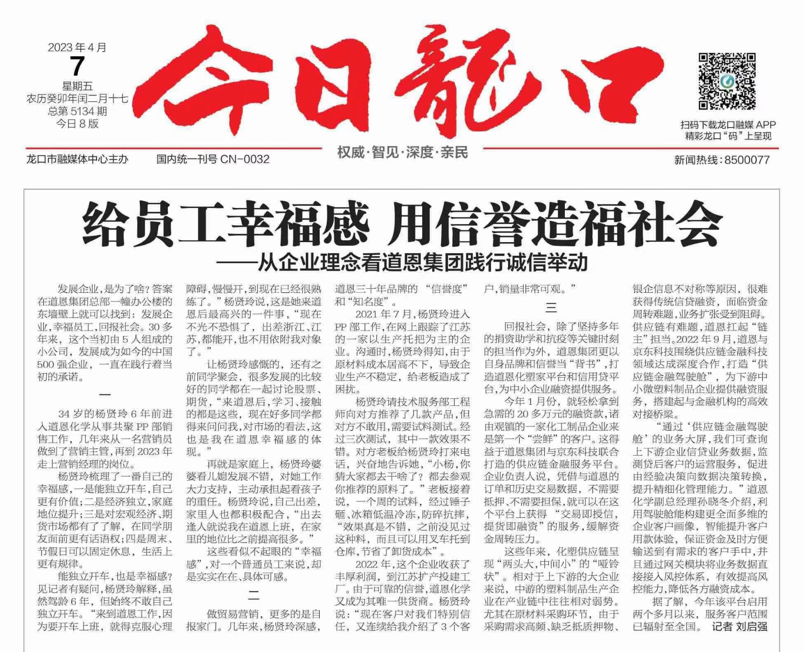 3月5日,在煙臺(tái)市發(fā)展和改革委員會(huì)舉辦的“親清發(fā)改會(huì)客廳”暨向民間資本開放項(xiàng)目專題推介會(huì)上,發(fā)布了煙臺(tái)市2024年首批誠(chéng)信典范企業(yè)名單,道恩集團(tuán)有限公司名列其中,這是道恩長(zhǎng)期堅(jiān)持和培育誠(chéng)信文化結(jié)出的新成果。