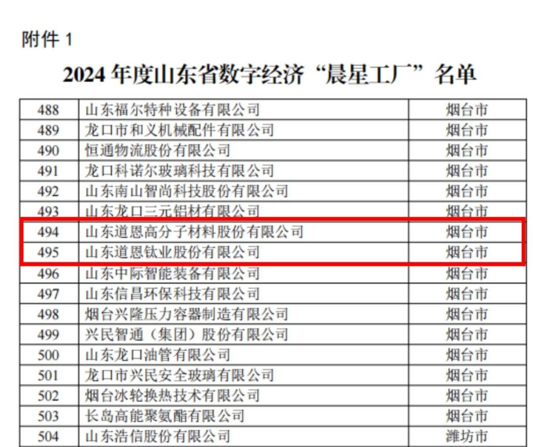 近日,山東省工信廳公布2024年度山東省數(shù)字經(jīng)濟(jì)“晨星工廠”名單,道恩股份、道恩鈦業(yè)公司雙雙名列其中。