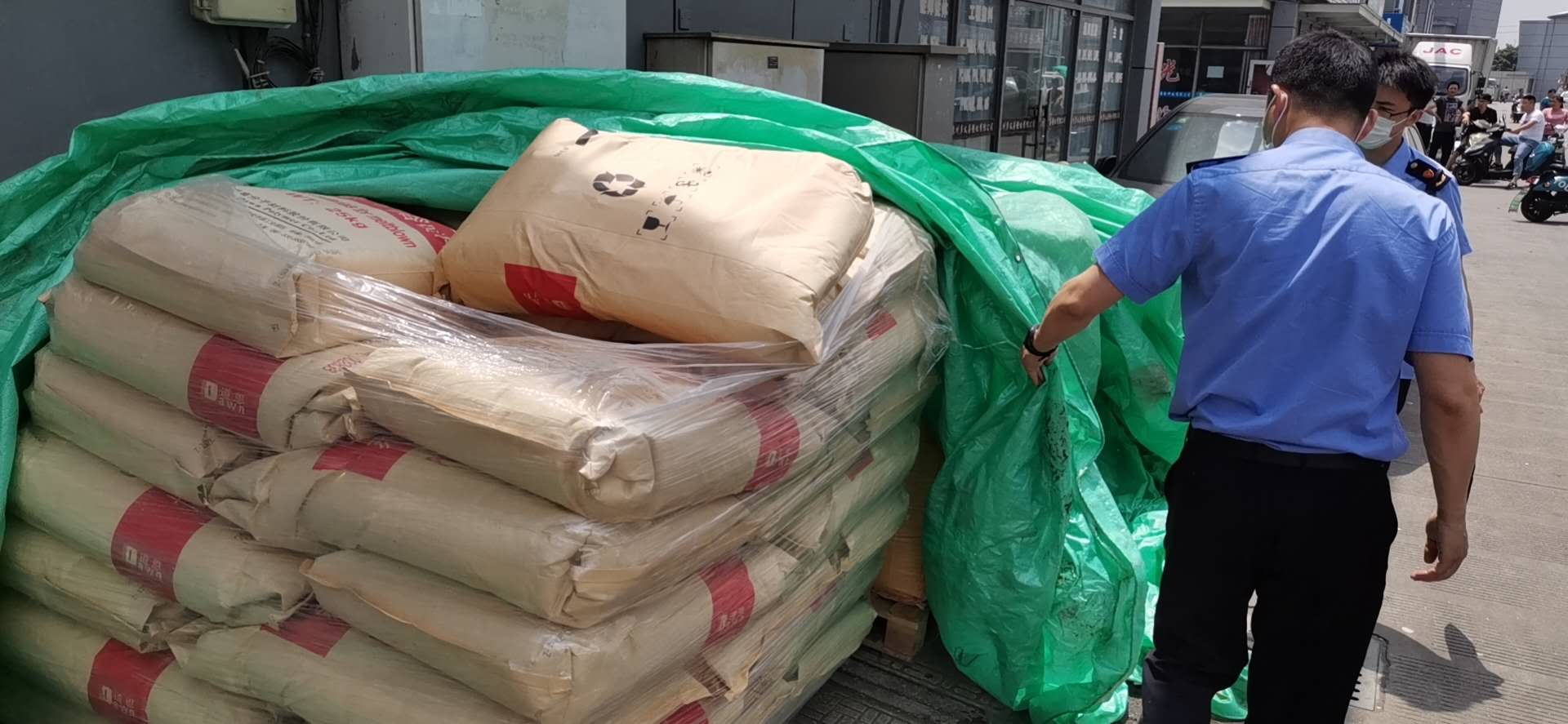 5月22日,道恩打假小組的行動還得到了當?shù)卣嚓P(guān)部門的鼎力支持,會同當?shù)卣沙龅墓ぷ魅藛T,共計百余人分為5隊,直奔塑化城展開地毯式排查。共排查商戶200余家,近千平方米,查扣涉嫌侵權(quán)聚丙烯熔噴專用料14.5噸,涉案貨值約100萬元。