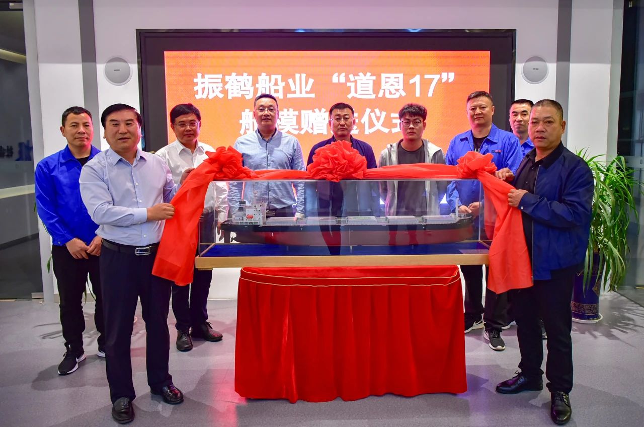 10月8日,寧波振鶴船業(yè)公司向道恩集團贈送“道恩17”輪船模儀式在道恩集團總部舉行,龍口市副市長趙樹杰,寧波振鶴船業(yè)公司董事長嚴星聰,道恩集團董事長于曉寧、副總裁宋慧東、分管領導解總、道恩國際物流公司總經(jīng)理韓永衛(wèi)出席活動。