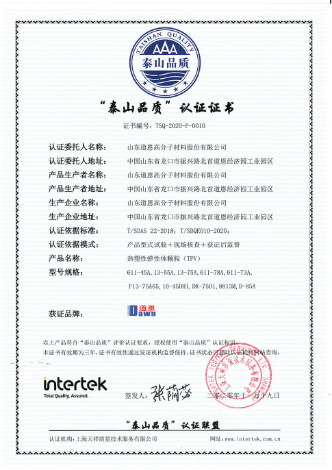 日前,道恩股份“熱塑性彈性體(TPV)”產(chǎn)品通過(guò)“泰山品質(zhì)”認(rèn)證, 成為“代表山東制造”的高端品牌。同時(shí),在剛剛結(jié)束的2020年度山東知名品牌認(rèn)定工作中,道恩股份聚丙烯(PP)熔噴專(zhuān)用料、道恩鈦業(yè)公司二氧化鈦顏料(金紅石型鈦白粉)被認(rèn)定為山東知名品牌(產(chǎn)品)。由此看出,道恩產(chǎn)品的品質(zhì)越來(lái)越高端,道恩品牌影響力越來(lái)越大。