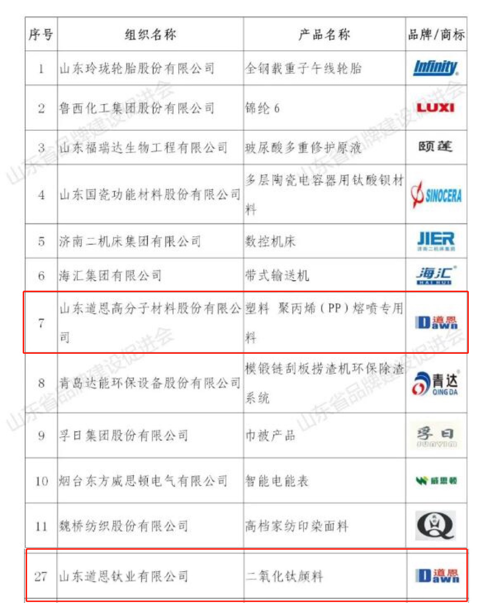高端品質(zhì)成就了具有競(jìng)爭(zhēng)力的道恩品牌。除了此次被認(rèn)定為山東知名品牌的聚丙烯(PP)熔噴專(zhuān)用料、二氧化鈦顏料(金紅石型鈦白粉)外,此前,道恩股份的“改性塑料”和“熱塑性硫化橡膠TPV”兩種產(chǎn)品被認(rèn)定為山東知名品牌(產(chǎn)品),道恩旗下榮暢物流公司的“物流服務(wù)”榮獲山東知名品牌(服務(wù))。至此,道恩5個(gè)產(chǎn)品或服務(wù)成為山東知名品牌。