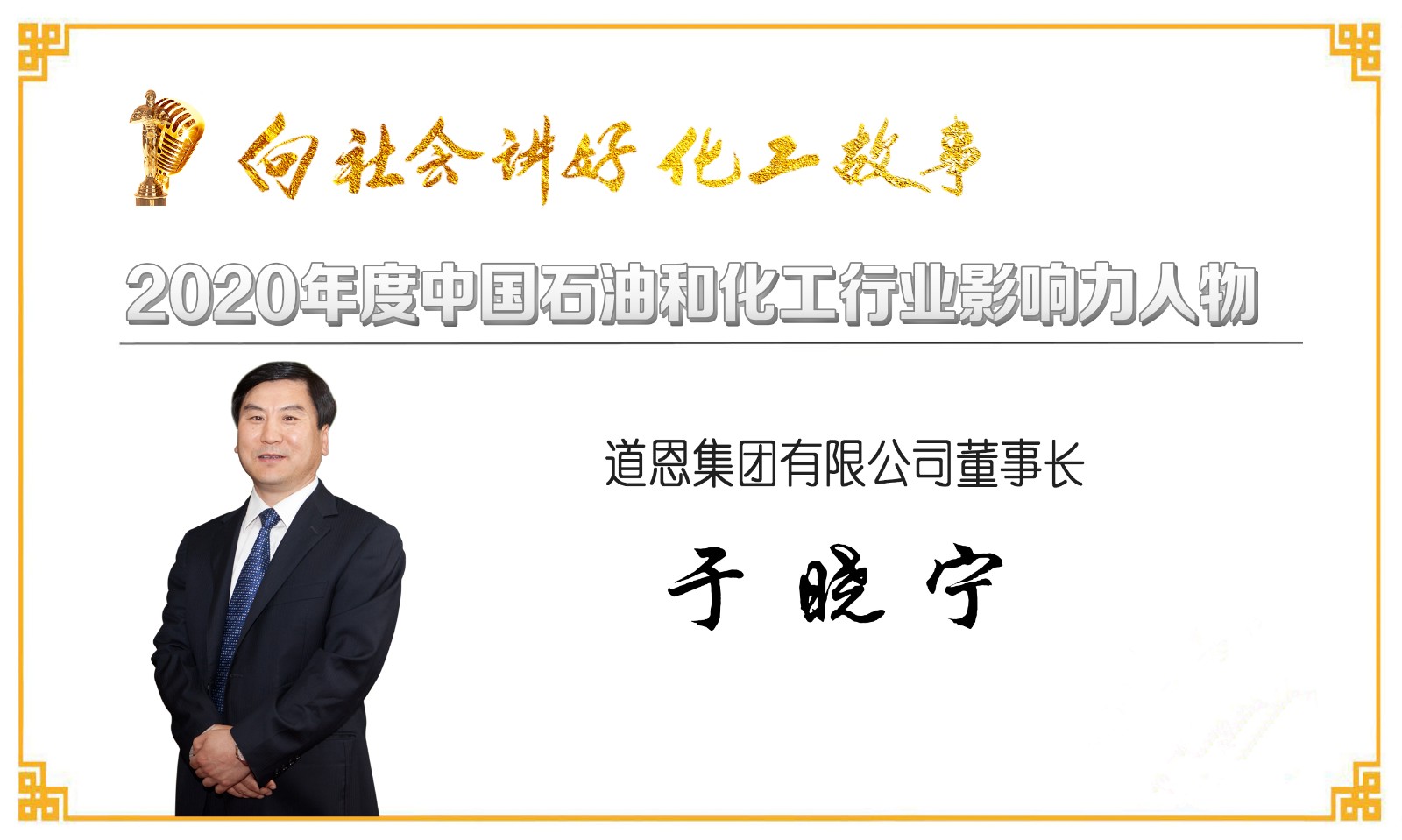 1月16日,2020年度中國石油和化工行業(yè)“十大新聞暨行業(yè)影響力人物”發(fā)布盛典舉行線上直播,道恩集團(tuán)董事長于曉寧榮獲2020年中國石化行業(yè)影響力人物。