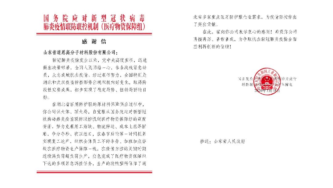 感謝信說,“2020年是極不平凡的一年,病毒突襲而至,疫情來勢洶洶。按照黨中央、國務(wù)院決策部署,科技部會同12個部門組建攻關(guān)組和專家組,成立工作專班,動員全國科技系統(tǒng)開展抗疫攻堅。”“科研攻關(guān)取得的成效離不開貴單位的參與和支持。在此,向貴單位在參與疫情防控應(yīng)急科研項目中所做的工作和付出的努力致以衷心的感謝。”感謝信對道恩人承擔應(yīng)急研發(fā)課題所作的貢獻表示感謝,同時鼓勵和鞭策企業(yè)在科研攻關(guān)方面取得更大突破。早在去年3月18日,一封來自國務(wù)院的感謝信,就把道恩股份推上了“熱搜”。