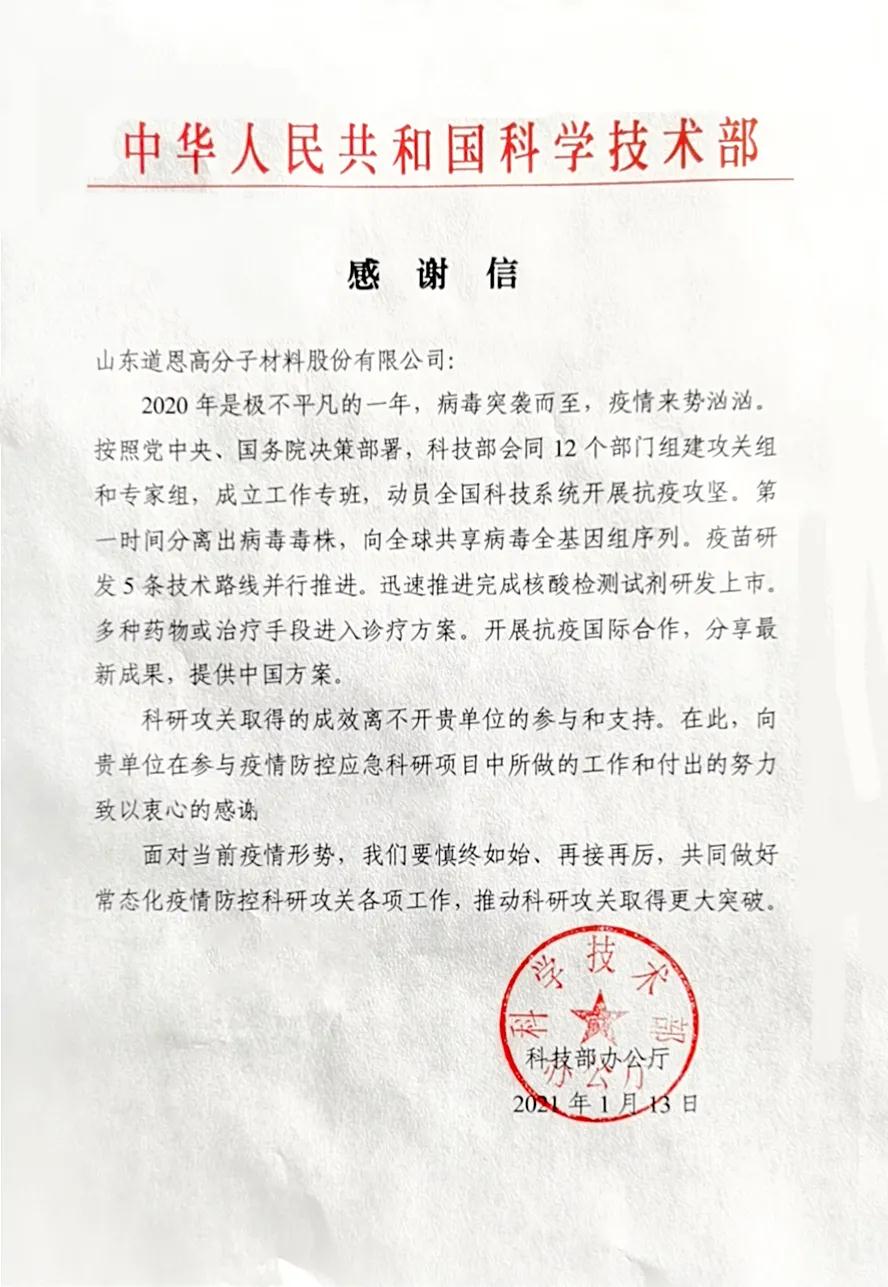 再獲“國字號”點贊!道恩收到國家科技部感謝信