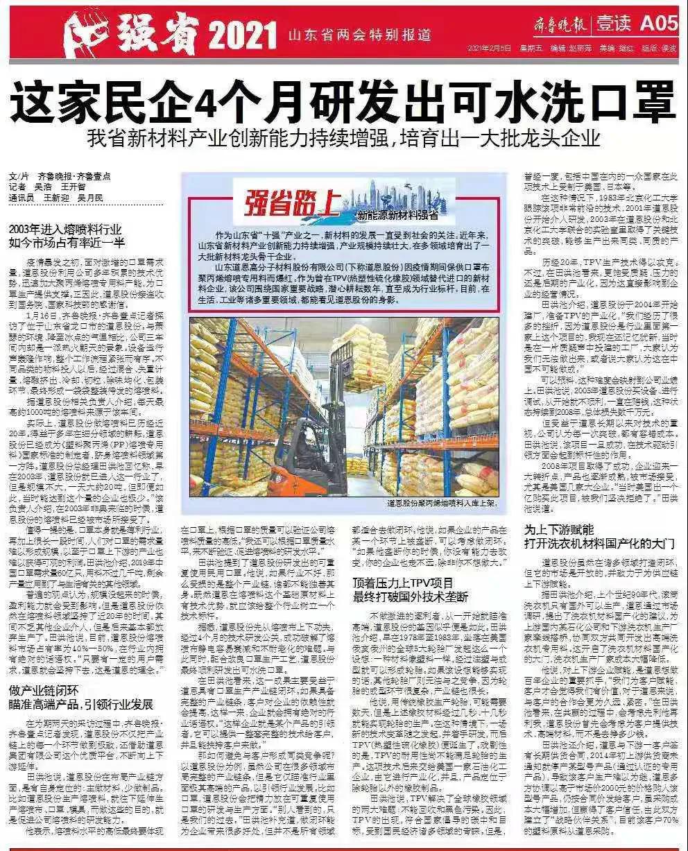 新年伊始,《齊魯晚報》圍繞“我省新材料產(chǎn)業(yè)創(chuàng)新能力持續(xù)增強(qiáng),培育出一大批龍頭企業(yè)”,以《這家民企4個月研發(fā)出可水洗口罩》為題聚焦道恩,在社會各界引起了強(qiáng)烈反響。