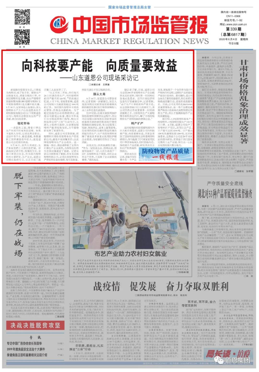 《中國市場監(jiān)管報》頭版頭條聚焦道恩股份