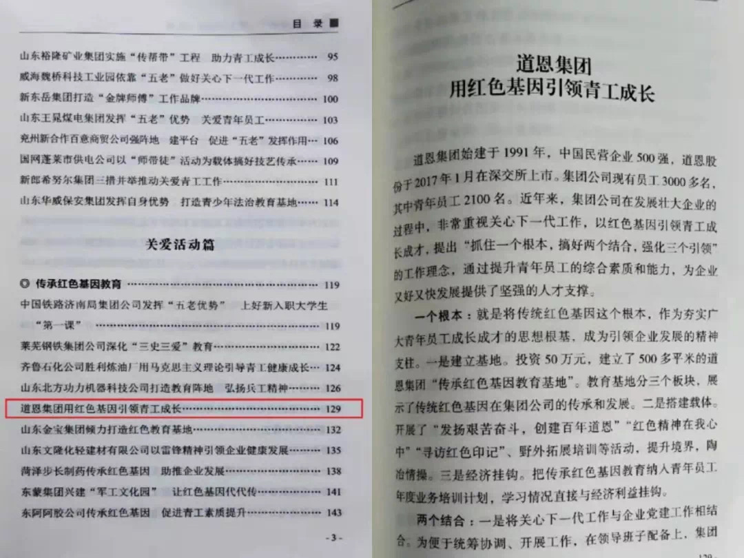 凝聚紅色動能,促進企業(yè)高質(zhì)量發(fā)展。道恩堅持把紅色“基因”融入企業(yè)“血脈”,讓每一名干部員工成為推動企業(yè)進步的紅色“細胞”,實現(xiàn)了員工成長與企業(yè)發(fā)展的同頻共振。2019年底,“道恩集團用紅色基因引領(lǐng)青工成長”成功入選山東省《企業(yè)關(guān)心下一代工作經(jīng)驗100例》,實現(xiàn)了員工物質(zhì)生活和精神生活的雙提升,進一步增強了企業(yè)的親和力、向心力和凝聚力。