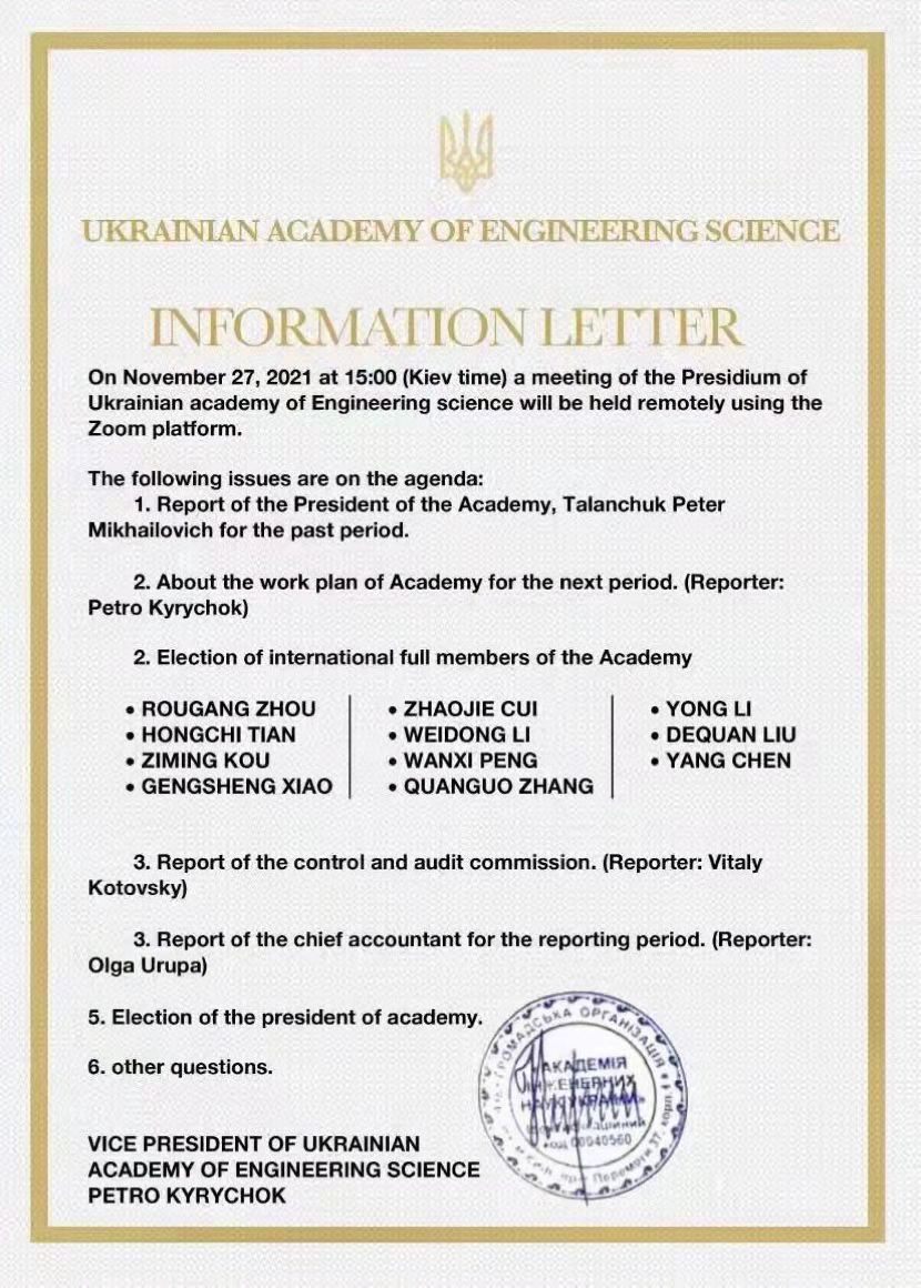 11月27日晚上,烏克蘭國家工程院主席團(tuán)會(huì)議宣布了2021年度當(dāng)選院士名單,道恩股份總經(jīng)理田洪池博士當(dāng)選為烏克蘭國家工程院外籍院士,這是山東煙臺首位來自民營企業(yè)的院士。據(jù)悉,與田洪池一同當(dāng)選的,還有國內(nèi)高校、企業(yè)的其他10位學(xué)者。