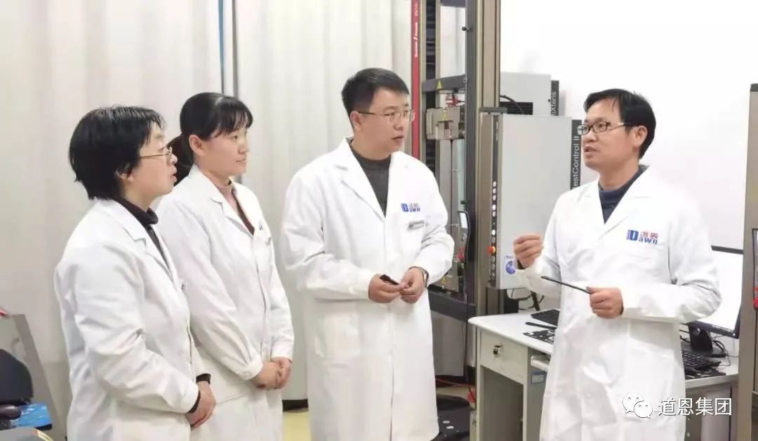 國家重點人才工程專家、道恩股份總經(jīng)理田洪池(右1)在技術(shù)中心指導(dǎo)工作