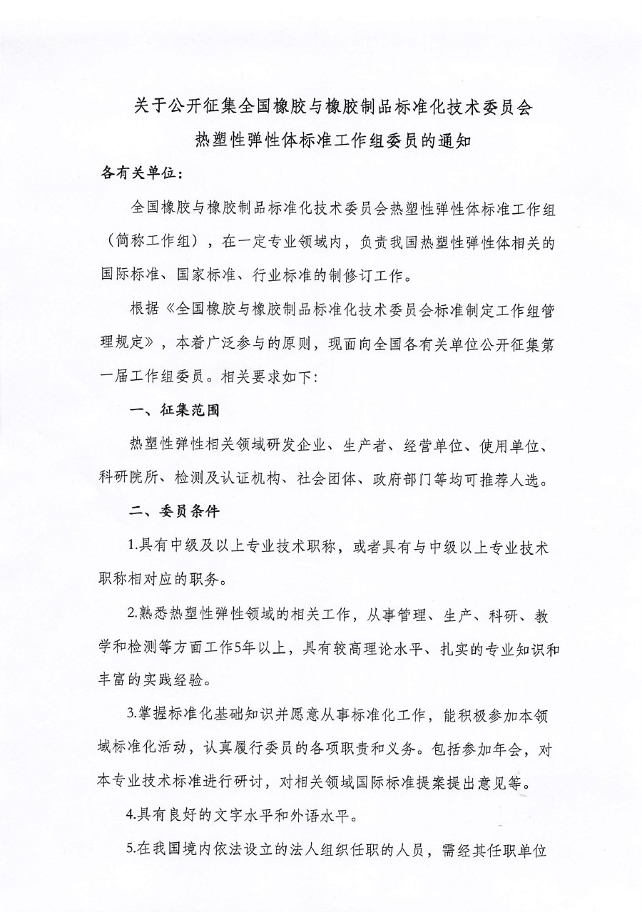 根據(jù)《全國橡膠與橡膠制品標準化技術(shù)委員會標準制定工作組管理規(guī)定》,本著廣泛參與的原則,現(xiàn)面向全國各有關(guān)單位公開征集第一屆工作組委員。相關(guān)要求如下: