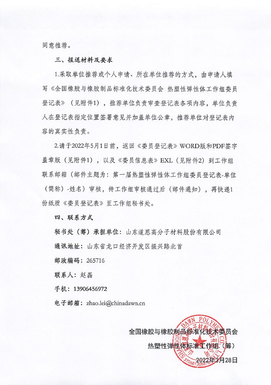 2.請于2022年5月1日前,返回《委員登記表》WORD版和PDF簽字蓋章版(見附件1),以及《委員信息表》EXL(見附件2)到工作組聯(lián)系郵箱(郵件主題為:第一屆熱塑性彈性體工作組委員登記表-單位(簡稱)-姓名)審核,待工作組審核通過后(郵件通知),再快遞1份紙質(zhì)《委員登記表》至工作組秘書處。