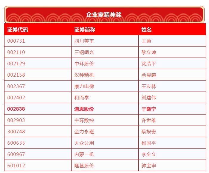 4月6日,第十七屆中國(guó)上市公司董事會(huì)“金圓桌獎(jiǎng)”獲獎(jiǎng)名單公布,道恩股份榮膺“優(yōu)秀董事會(huì)”,道恩股份董事長(zhǎng)于曉寧榮獲“企業(yè)家精神獎(jiǎng)”。