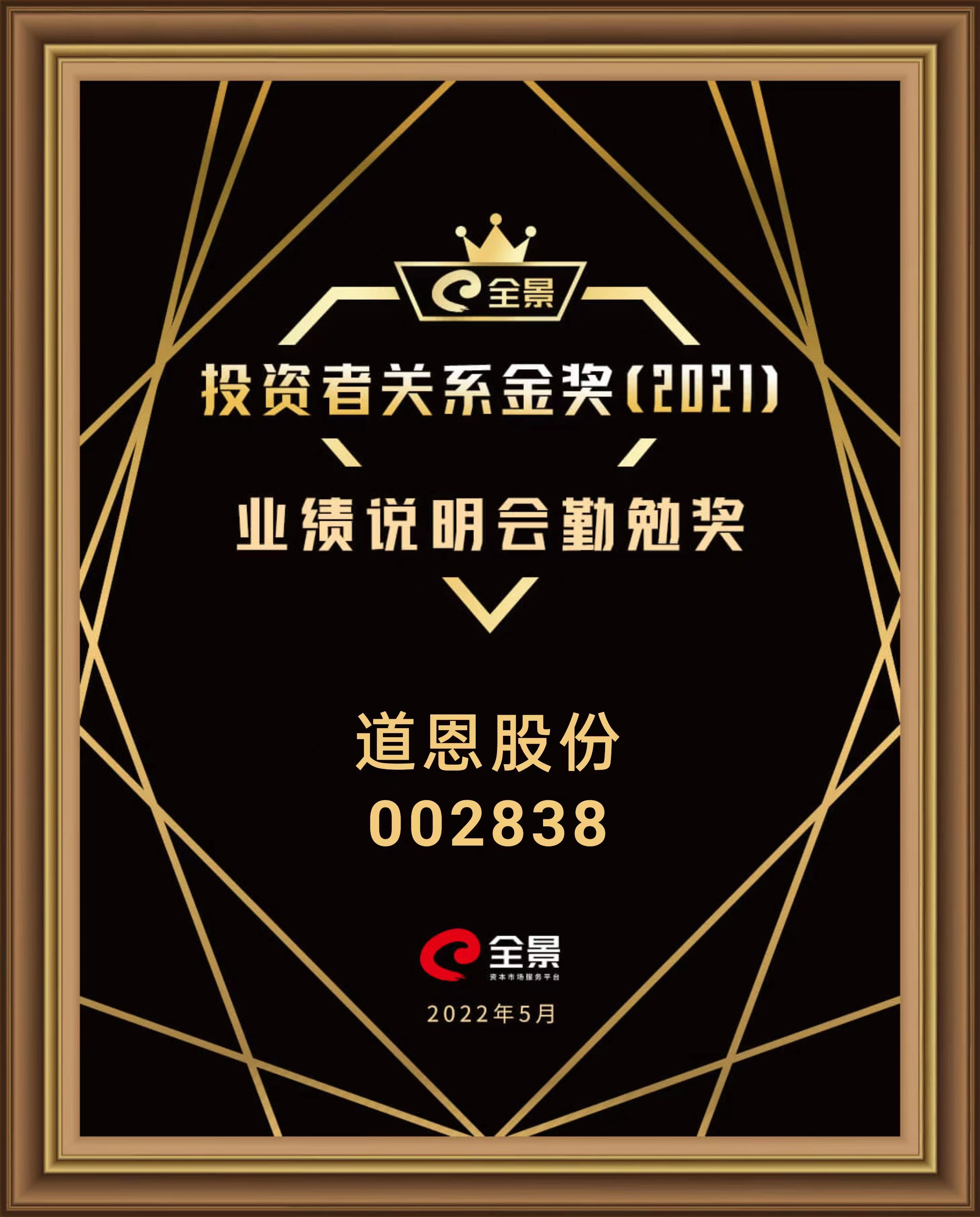 近日,“全景投資者關(guān)系金獎(2021)”獲獎榜單正式揭曉,道恩股份榮獲“業(yè)績說明會勤勉獎”。