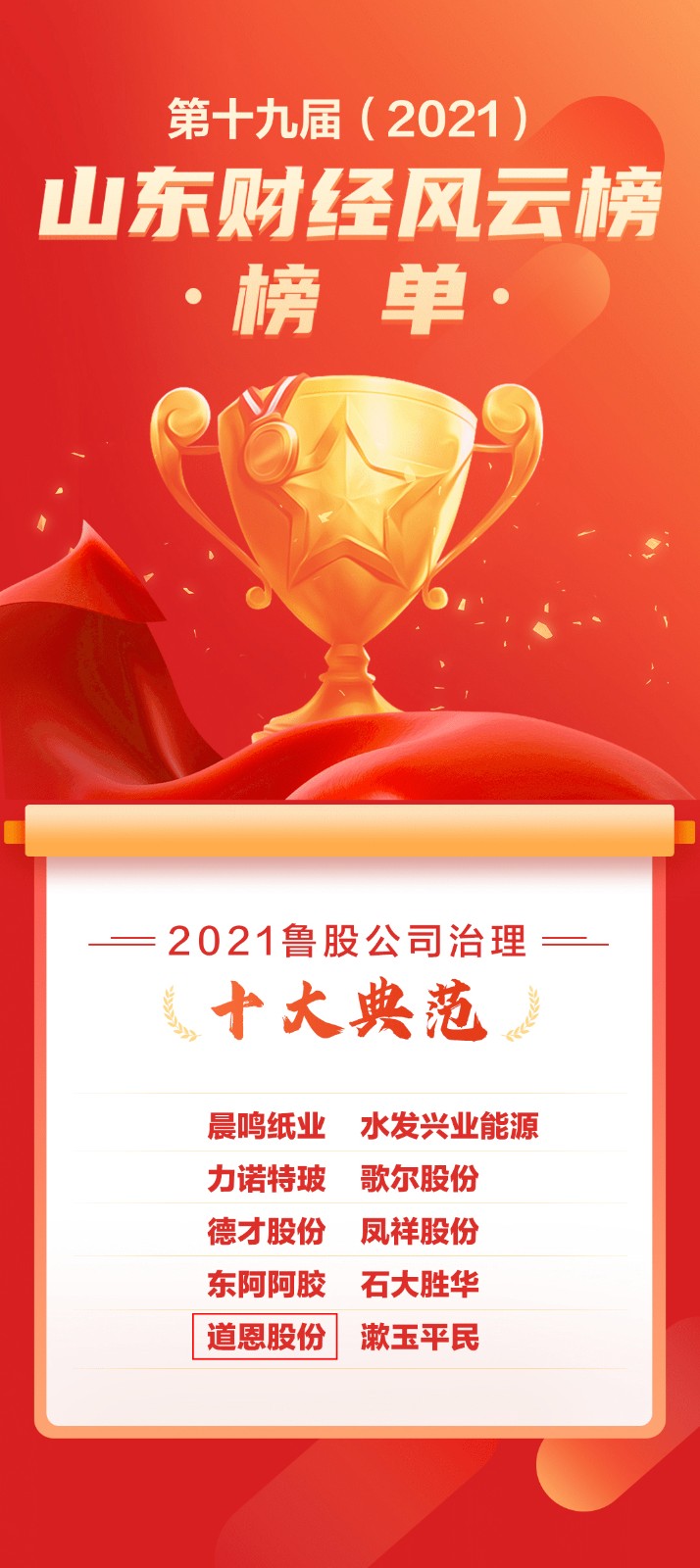 6月28日下午,“奮力走在前——第十九屆(2021)山東財經(jīng)風(fēng)云榜”頒獎盛典在濟南舉行。道恩股份榮獲“2021山東財經(jīng)風(fēng)云榜魯股公司治理十大典范”。