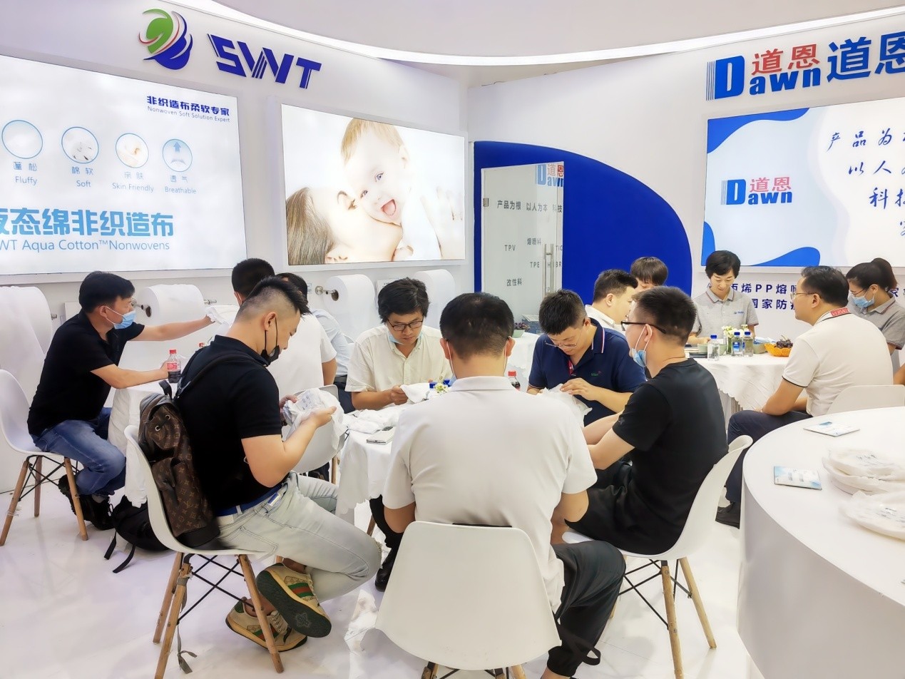 后疫情時(shí)代,非織造布價(jià)格競(jìng)爭(zhēng)進(jìn)入白熱化階段,但產(chǎn)品高端化、差異化需求旺盛。道恩斯維特公司總經(jīng)理慎張飛介紹,公司緊盯行業(yè)前沿,研發(fā)推出了全新產(chǎn)品并列雙組份Premium 液態(tài)綿,具有超蓬松、高透氣、超柔軟、零刺激等特色,在拉拉褲腰圍應(yīng)用中可以和紡粘非織造布隨意搭配,且不影響尿褲線的生產(chǎn)效率,成為展會(huì)又一大亮點(diǎn)。