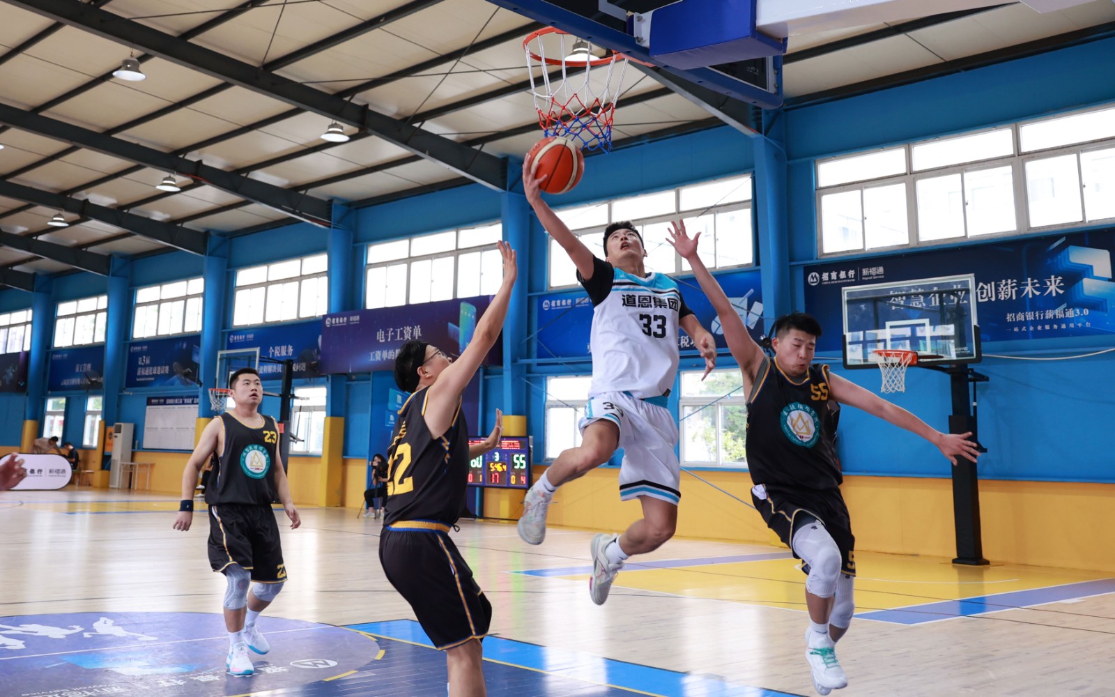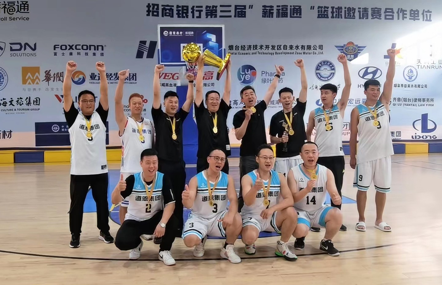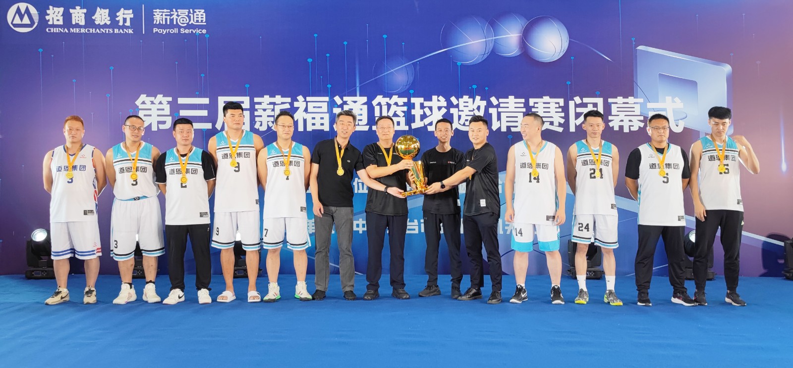 9月6日下午,由招商銀行煙臺分行舉辦的第三屆“薪福通”籃球邀請賽閉幕式在煙臺舉行,道恩集團籃球隊作為冠軍球隊參加活動,道恩集團副總裁宋慧東及隊員上臺領獎,張同新榮獲賽事最有價值球員。