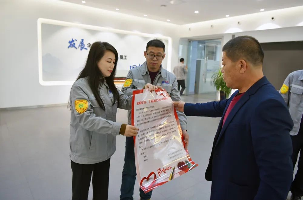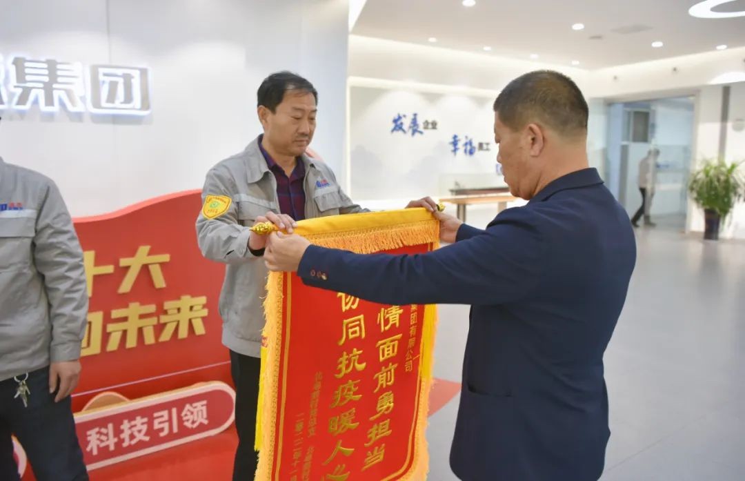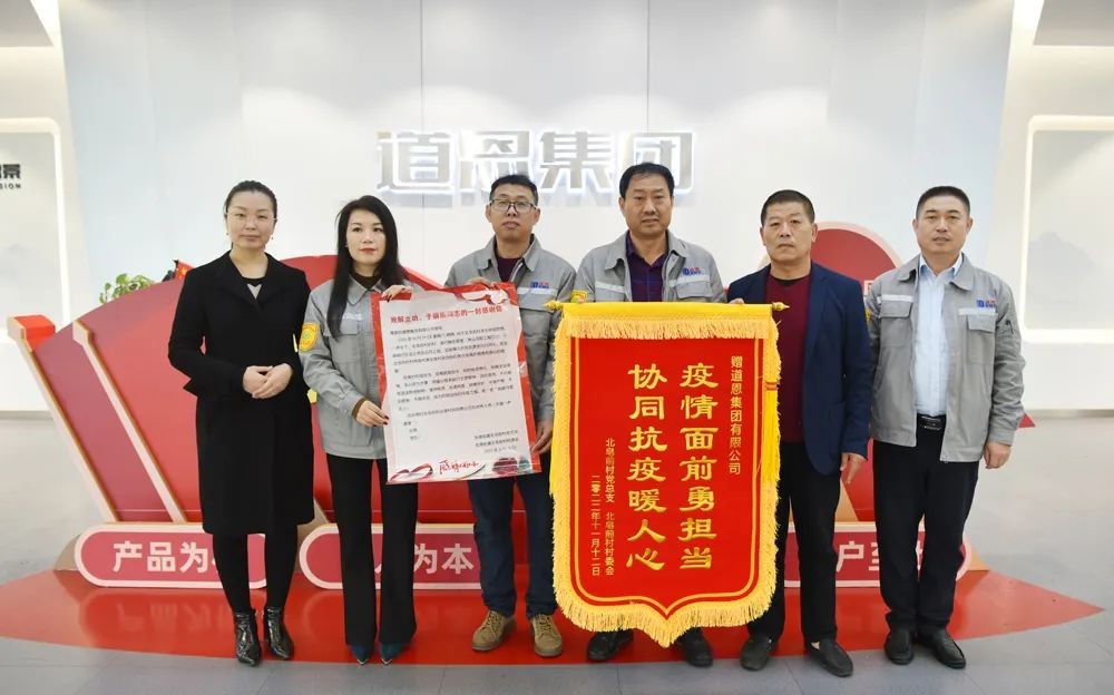 11月12日上午,龍口市龍港街道北皂前村黨總支書記姜思成,攜帶一面印有“疫情面前勇?lián)?dāng)、協(xié)同抗疫暖人心”字樣的錦旗和一封感謝信,走進(jìn)道恩集團(tuán)總部大樓,對(duì)該集團(tuán)員工解立功、于麗麗在村居封控期間,參與抗疫志愿服務(wù)的愛心行動(dòng)深表敬意和謝意。