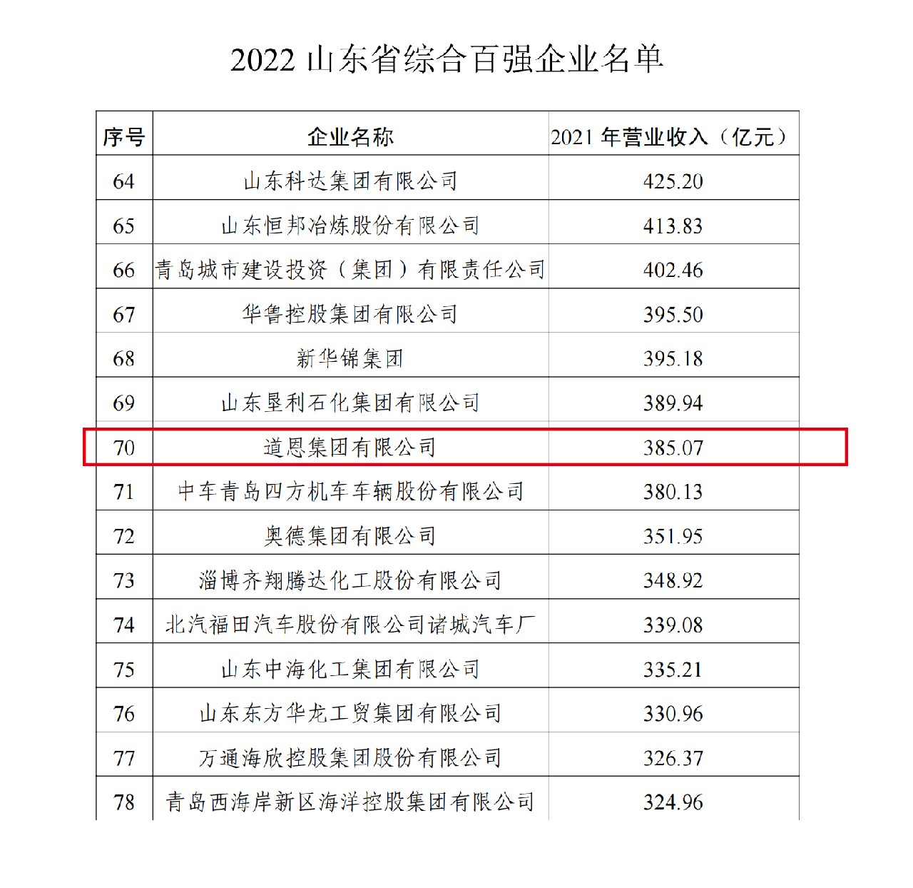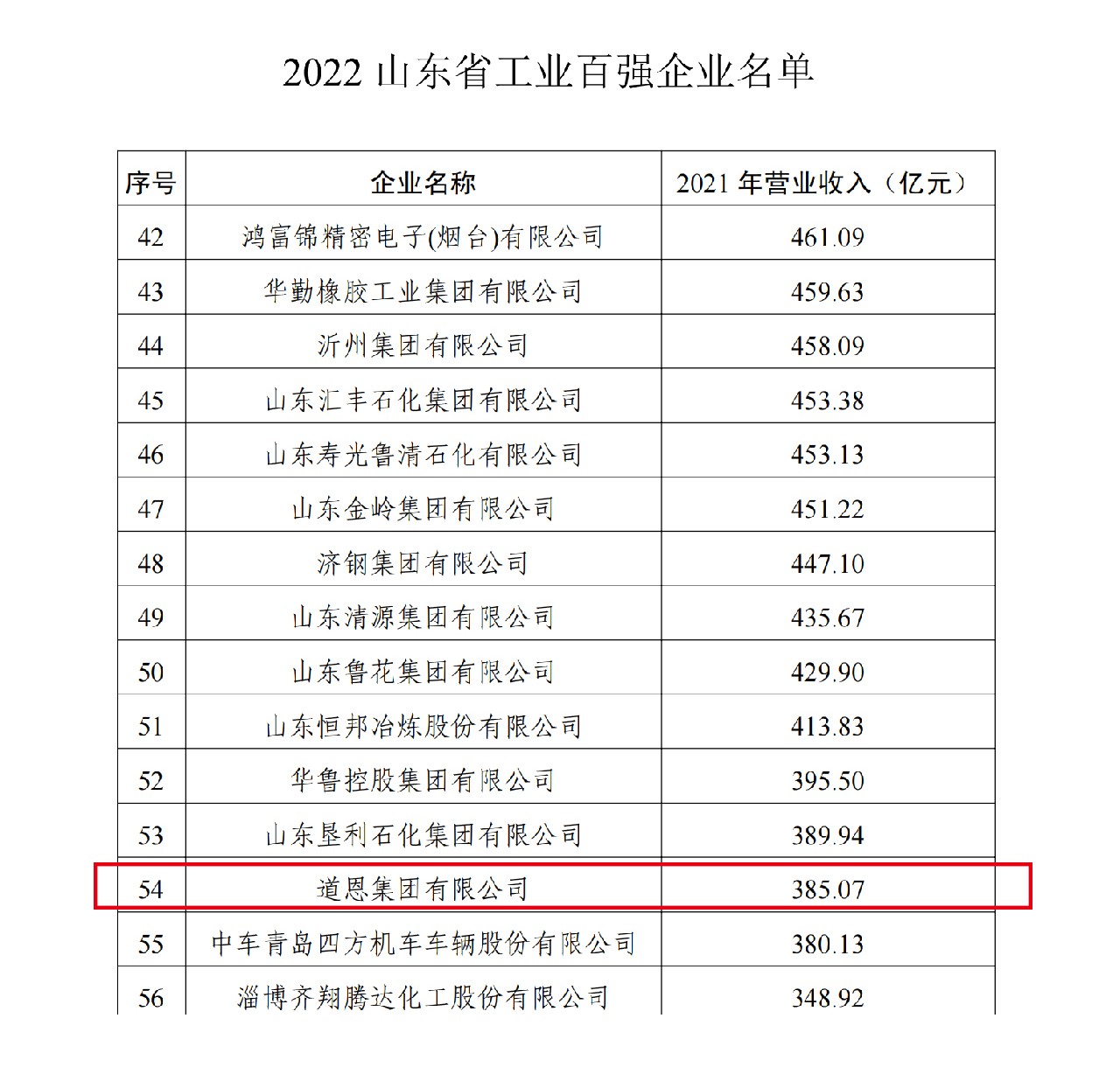 近日,山東省工業(yè)和信息化廳、山東省企業(yè)聯(lián)合會公布2022山東企業(yè)百強(qiáng)名單,道恩集團(tuán)入選綜合百強(qiáng)企業(yè)第70名和工業(yè)百強(qiáng)企業(yè)第54名。