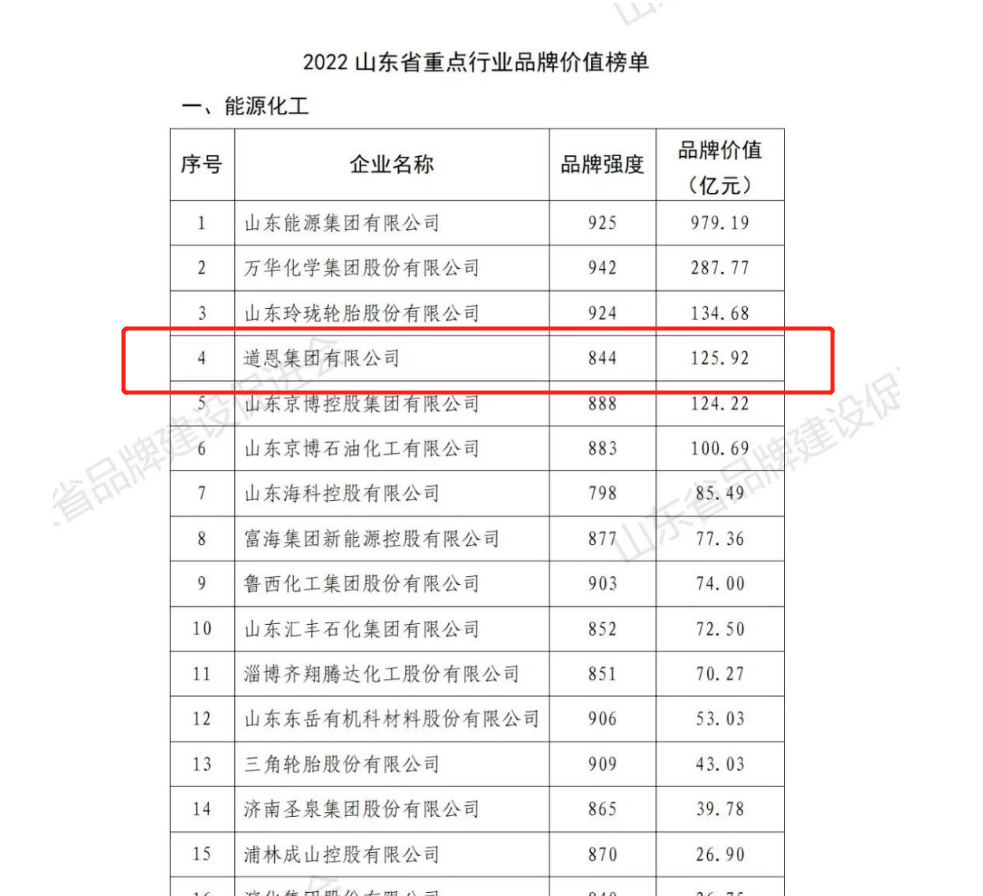 道恩再登山東重點(diǎn)行業(yè)品牌價(jià)值榜,位列能源化工領(lǐng)域第4名