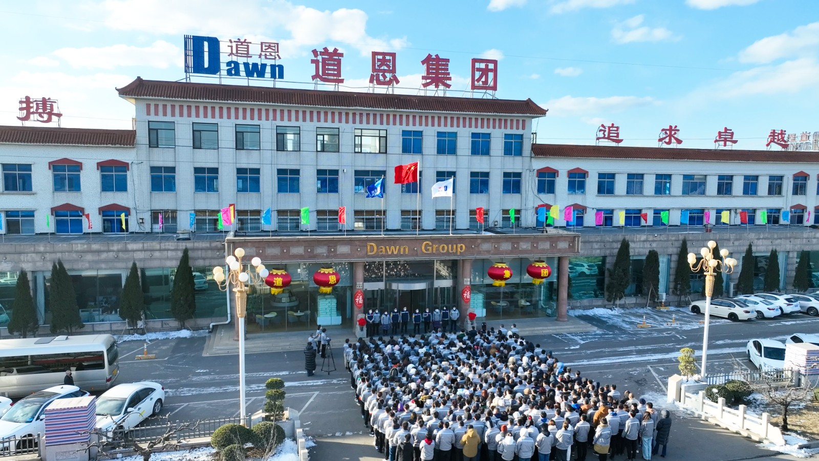 “建功新時代,奮進新征程,創(chuàng)造新偉業(yè)!”是日上午8點38分,在道恩集團駐地1號辦公樓前,道恩人用富有激情的口號和積極向上的斗志,回應(yīng)前來拜年的集團公司領(lǐng)導(dǎo)班子,共同迎接節(jié)后第一個工作日。煙花爆竹齊鳴,彩煙騰空而起,現(xiàn)場人聲鼎沸,烘托了紅紅火火的熱烈氛圍。
