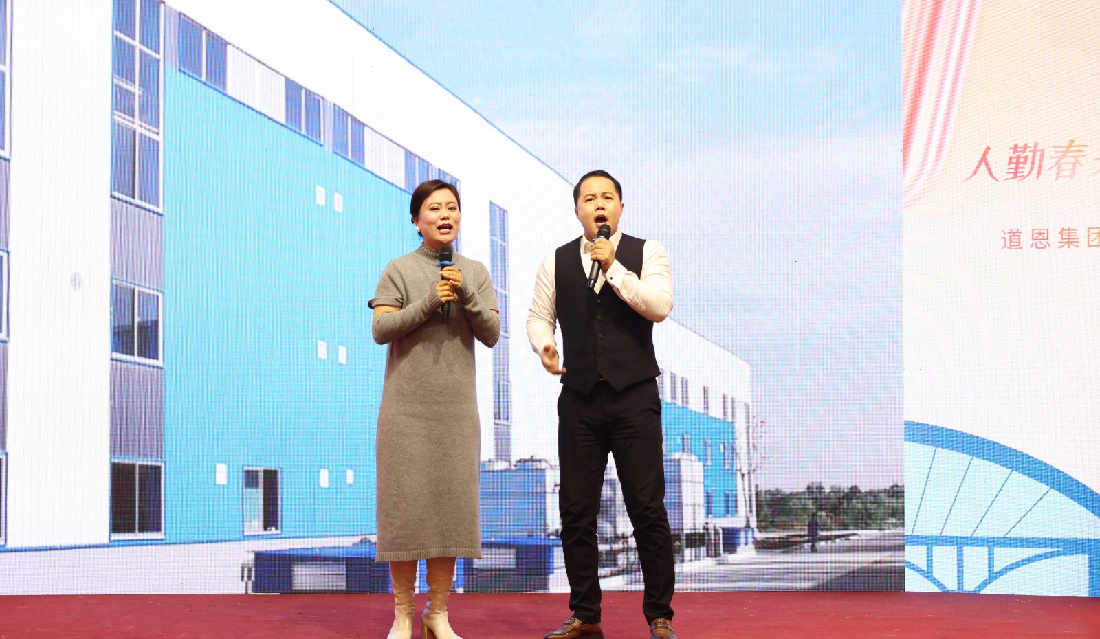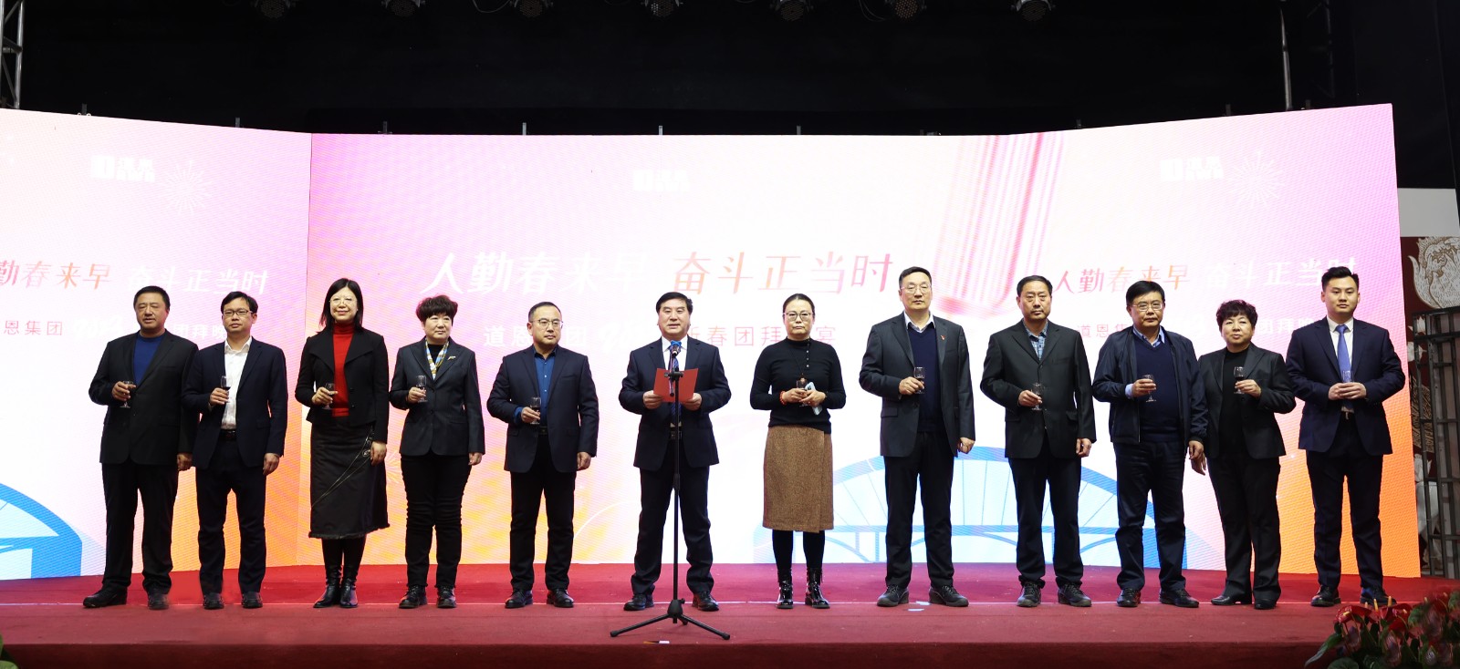 隨后,集團公司領(lǐng)導(dǎo)分別前往龍口駐地各經(jīng)營單位,慰問廣大干部員工,并與駐外企業(yè)進行視頻連線,送去集團公司的祝福。大家信心滿滿,以高昂的團隊士氣展現(xiàn)了新一年奮發(fā)向上的激情和魄力,進一步濃化了“比學(xué)趕幫超”的文化氛圍。當天晚上,道恩集團在道恩湖畔酒店三樓宴會廳舉行了以“人勤春來早,奮斗正當時”為主題的新春團拜晚宴。集團公司董事會成員、領(lǐng)導(dǎo)班子成員,副部級以上干部、青年干部培訓(xùn)班成員以及員工代表參加活動。