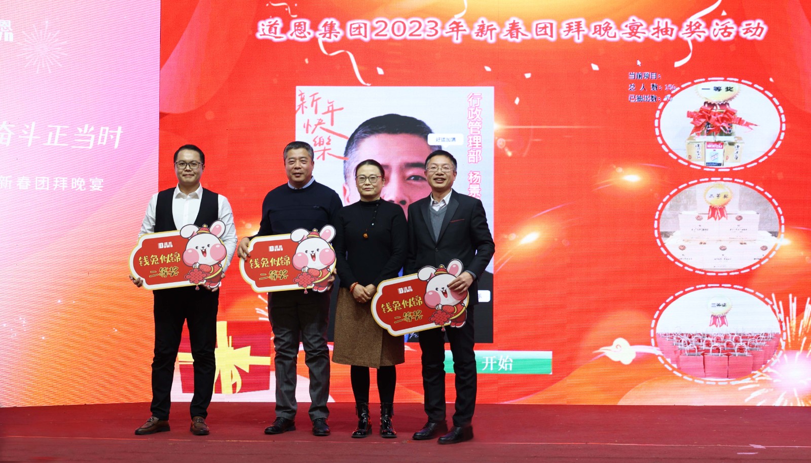 “幸運之星”的抽獎環(huán)節(jié)點燃了晚宴高潮。一波接一波的幸運大抽獎,帶動了現(xiàn)場的激情氛圍。獲獎人員依次上臺領(lǐng)獎、合影,與大家共同分享這份喜悅與幸運。整場晚宴精彩紛呈,濃郁的道恩文化氣息與喜慶的新春氛圍熱烈濃厚。