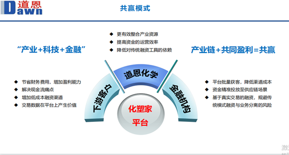 供應(yīng)鏈有難題,道恩扛起“鏈主”擔(dān)當(dāng)。據(jù)介紹,道恩擁有30多年的化塑貿(mào)易產(chǎn)業(yè)沉淀,主營各種合成樹脂、合成橡膠等產(chǎn)品,是中石油、中石化、中海殼牌、巴塞爾、沙特阿美等國內(nèi)外大型石化公司的區(qū)域一級分銷商或代理商。近年來,道恩致力于“化塑產(chǎn)業(yè)一站式服務(wù)生態(tài)圈”,推出了化塑家產(chǎn)業(yè)互聯(lián)網(wǎng)服務(wù)平臺。在此前的2022年9月,道恩與京東科技圍繞供應(yīng)鏈金融科技領(lǐng)域達(dá)成深度合作,打造“供應(yīng)鏈金融駕駛艙”,為下游中小微塑料制品企業(yè)提供融資服務(wù),搭建起與金融機(jī)構(gòu)的高效對接。
