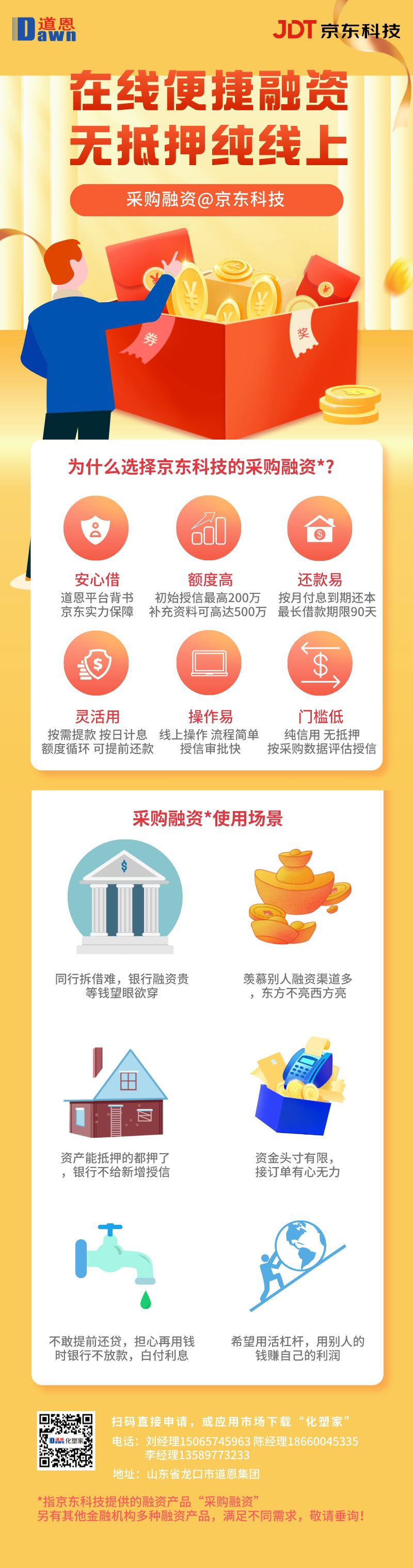 軍凱塑業(yè)是一家塑料制品加工企業(yè),也是道恩的下游客戶。程先生表示,憑借與道恩的訂單和歷史交易數(shù)據(jù),在道恩供應(yīng)鏈金融服務(wù)平臺可以獲得“交易即授信,提貨即融資”的服務(wù),緩解資金周轉(zhuǎn)壓力。