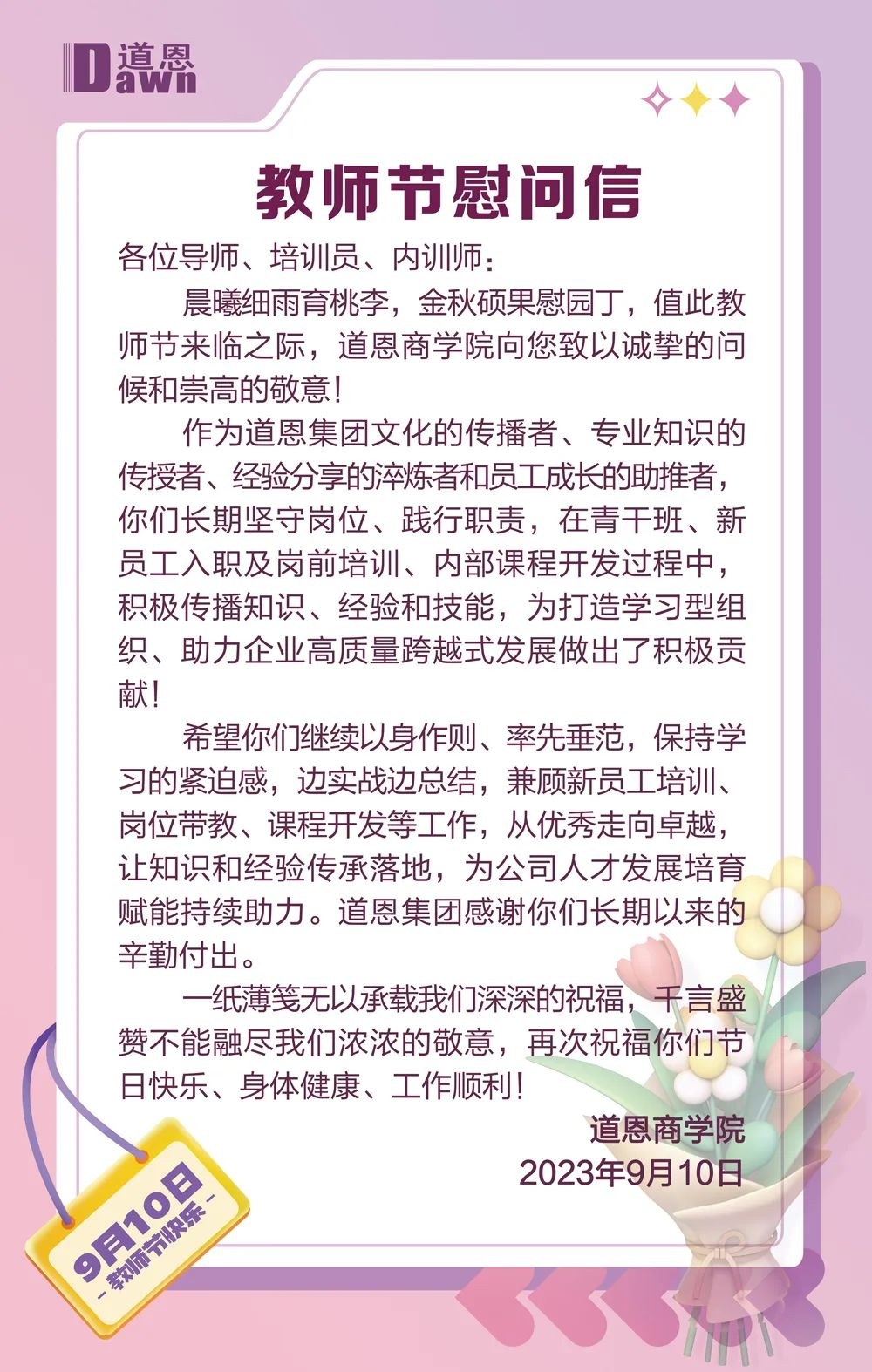 多年來,道恩集團始終崇尚尊師重道,致力于支持教育事業(yè)發(fā)展的同時,在企業(yè)內部精心打造了道恩商學院,構建了完善的培養(yǎng)體系,深入推行導師制,培養(yǎng)了高素質的內訓師隊伍。教師節(jié)前夕,道恩商學院向廣大導師、培訓員和內訓師致信表示慰問。