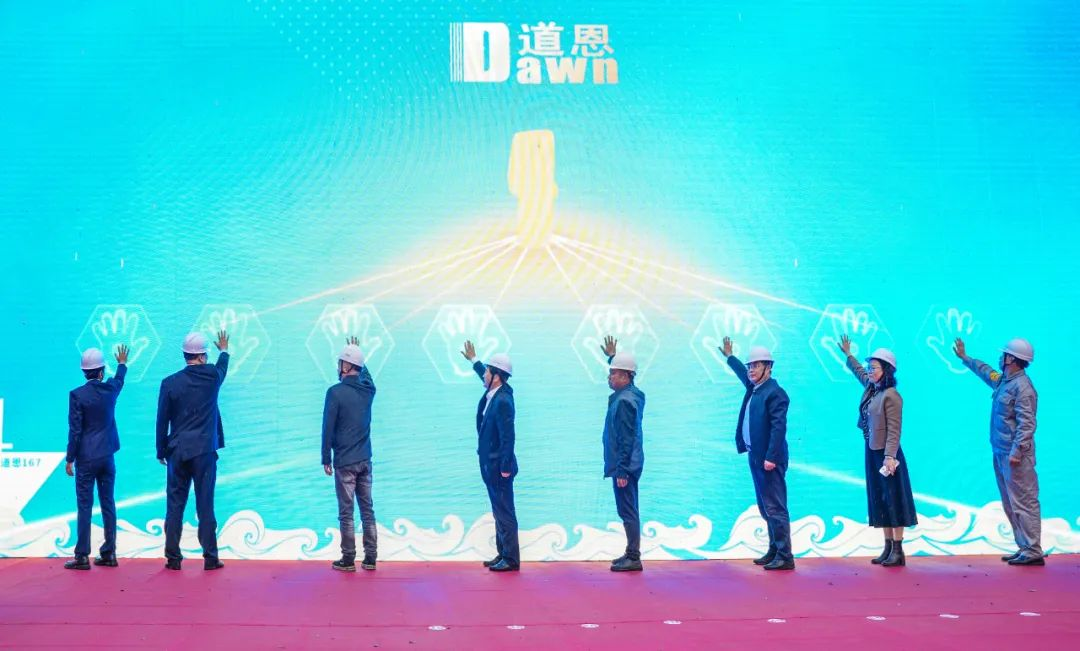 活動(dòng)現(xiàn)場(chǎng),彩旗招展。冒雨參加儀式的領(lǐng)導(dǎo)和嘉賓共同觀看了視頻短片,回顧了“道恩167”輪是怎樣建成的。
